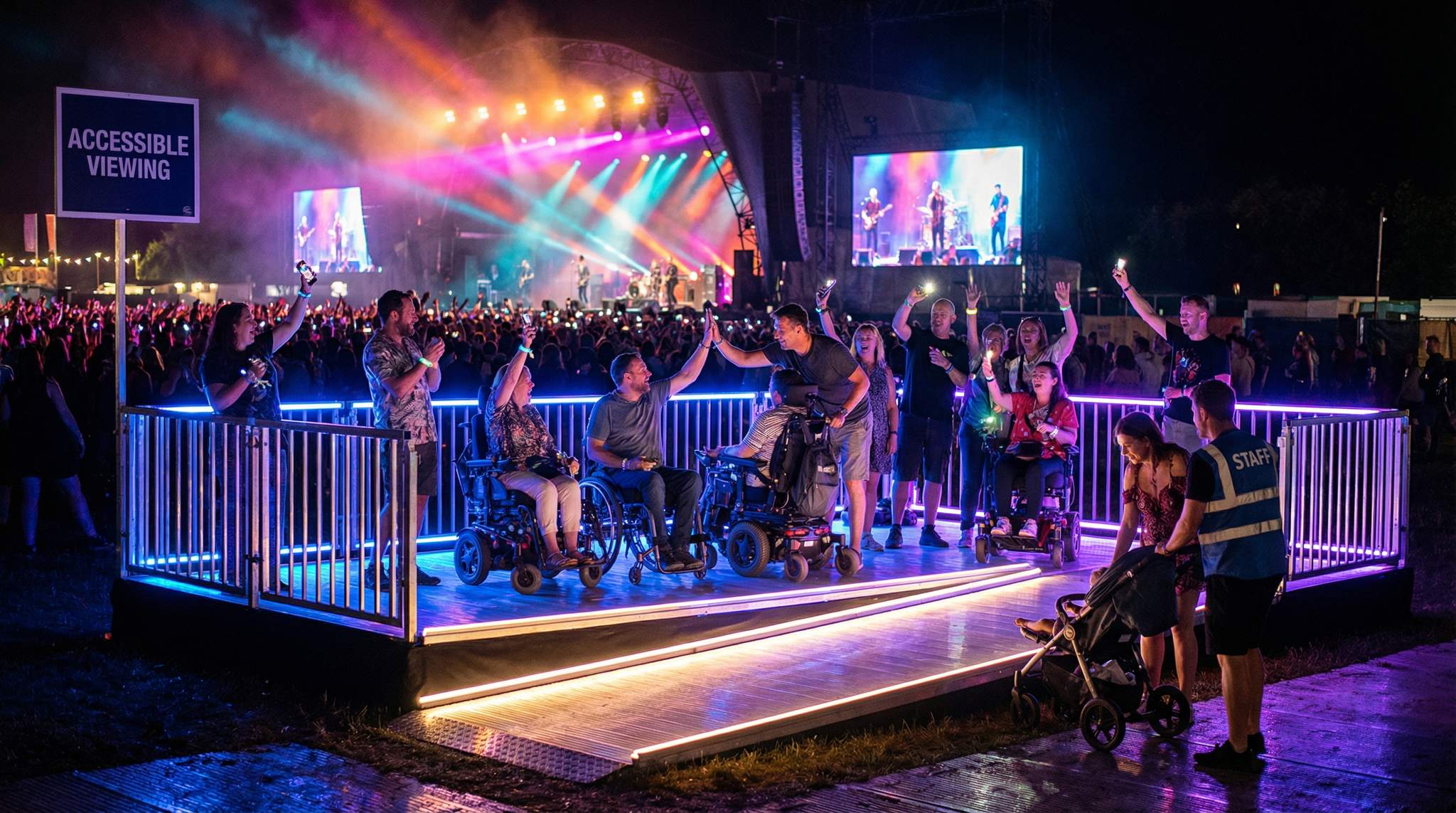 - Dedicated Platforms: For music and performance stages, provide raised viewing platforms reserved for disabled attendees (plus their companions). These platforms should be sturdily constructed, with ramp access (meeting the same gentle slope guidelines), and enclosed or stewarded so that only those who need them use them. Place them at a height that allows a seated person to see over standing crowds, a necessity highlighted by Euan’s Guide on accessible viewing platform standards – a common mistake is building platforms only a few inches too low, which can still result in obstructed sightlines if the crowd in front raises their arms or stands on tiptoes, creating significant barriers for seated attendees. It’s wise to slightly overshoot on height (while remaining safe and not too steep on the ramp) to guarantee a clear view.