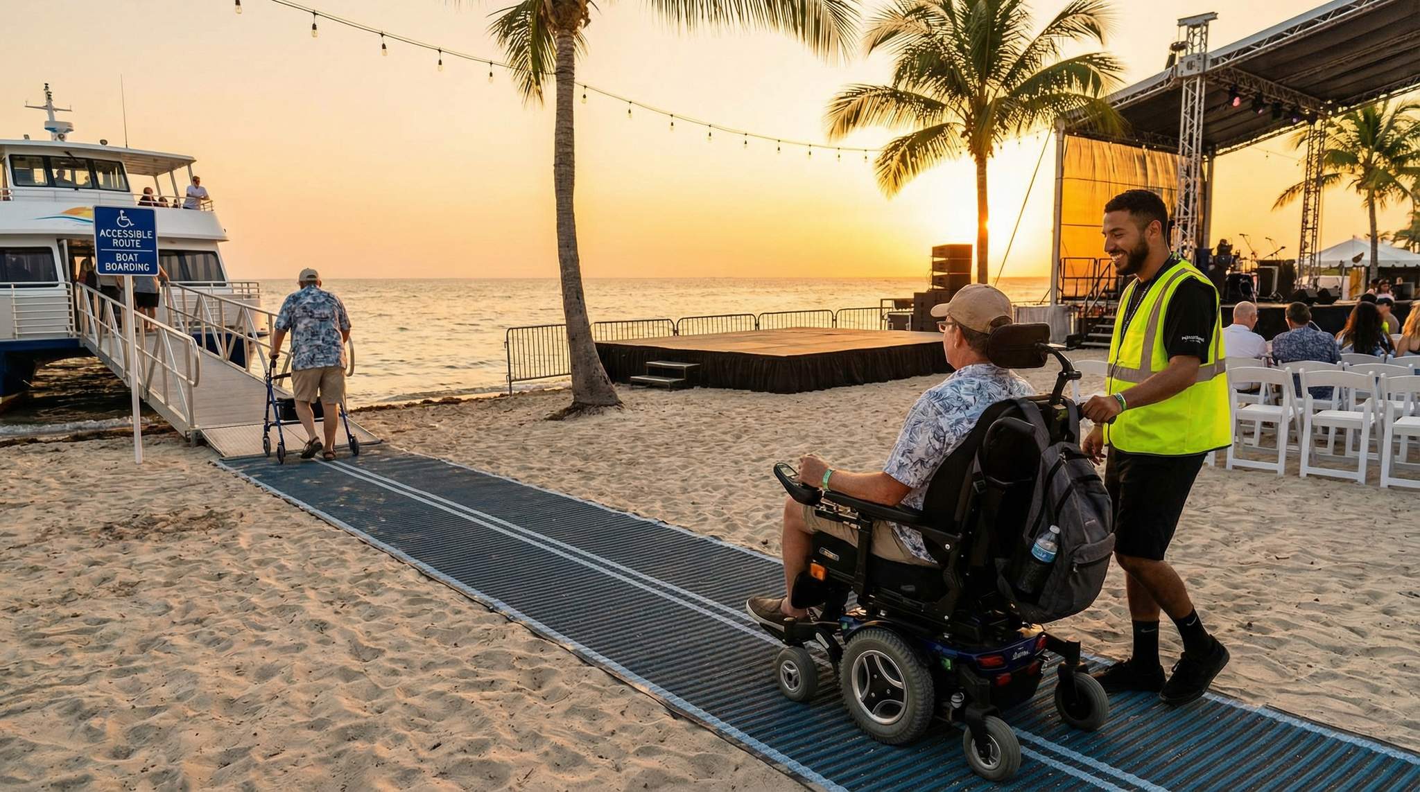 Every festival site has its own terrain profile, and understanding it is the first step to making it accessible. Beaches, deserts, and sand can be extremely difficult for standard wheelchairs or anyone with limited mobility – wheels sink in loose sand and walking can be strenuous. Grass fields, campsites, and rural farms may have mud, bumpy ground, or uneven paths that trip up those with mobility aids or visual impairments. Boat-based venues and island festivals introduce another layer of complexity: moving between land and water, and navigating vessels safely. Festival organizers around the world have learned that early assessments of the site’s natural and built environment are crucial. By walking the grounds (or sailing the route) from the perspective of a disabled attendee, festival organizers can identify obstacles such as steps, gaps, steep slopes, soft sand stretches, or narrow docks. Once the challenges are mapped out, targeted solutions can be designed for each scenario – from laying down temporary pathways to arranging specialized transportation. The goal is universal access: ensuring that no matter the terrain, attendees with disabilities can reach essential areas (stages, restrooms, food stalls, campgrounds) with dignity and comfort.
