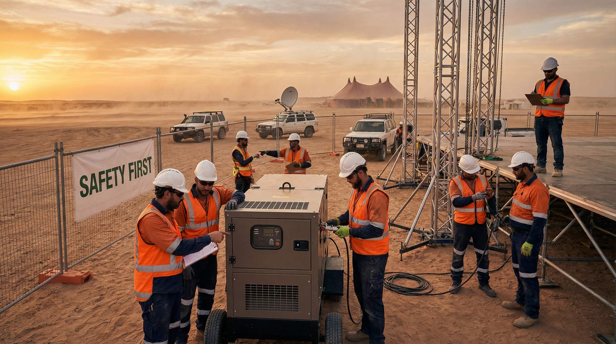 - Has Relevant Experience: Contractors should demonstrate a track record of working in wilderness or remote settings. For example, a festival in the Australian outback or the Sahara desert requires a stage rigging company with experience handling high winds and sand, and an electrical team adept with portable generator power systems. Festival organizers should ask potential contractors about past projects in remote or extreme conditions and discuss how they handled those challenges.
