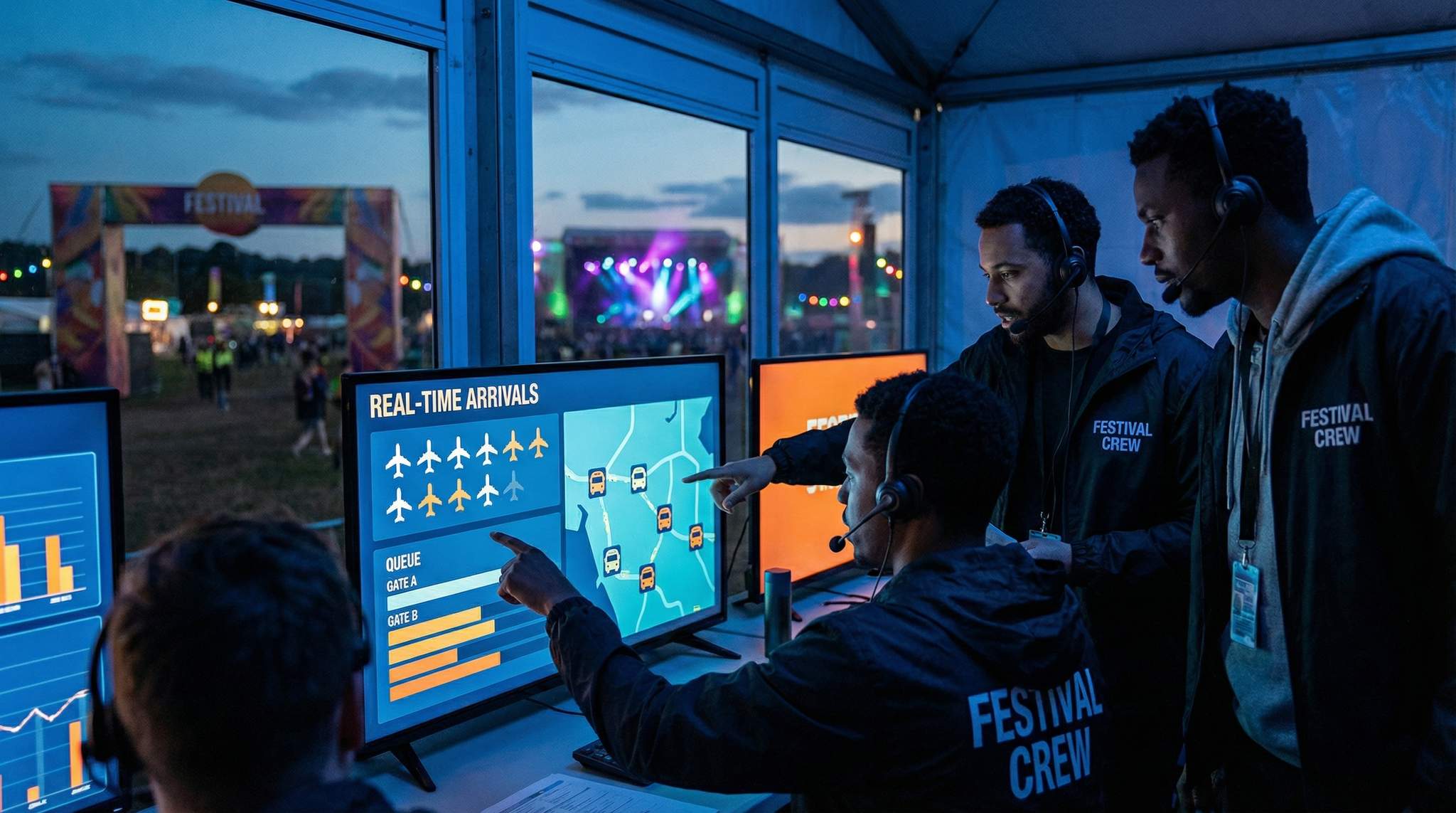 Bringing together all these data streams – flights, entry queues, shuttles, and more – is the concept of a centralized real-time operations dashboard. Many large-scale festivals now operate a command center (often a trailer or tent outfitted with radios, computers, and screens) where leads from each department (security, ticketing, transportation, medical, etc.) sit together. On the wall, multiple monitors might display different dashboards: weather radar, security incidents, and crucially, the arrival & queue dashboard described above.