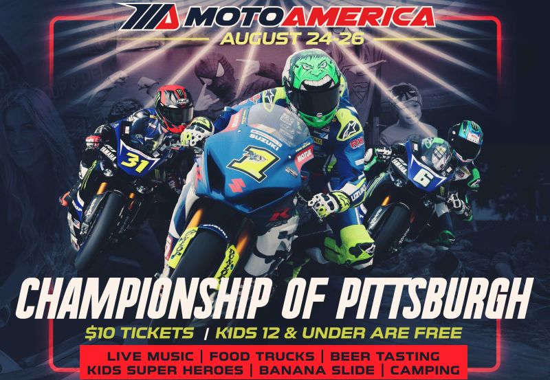 Experience live world-class motorcycle racing at nearly 200 miles per hour when MotoAmerica comes back to Pittsburgh International Race Complex, August 24th-26th! A jam-packed 80’s themed weekend awaits, including a banana slide, camping, beer tasting, the best 80s music you’ve heard since 1989, and the dramatic second half of the American championships of road racing!