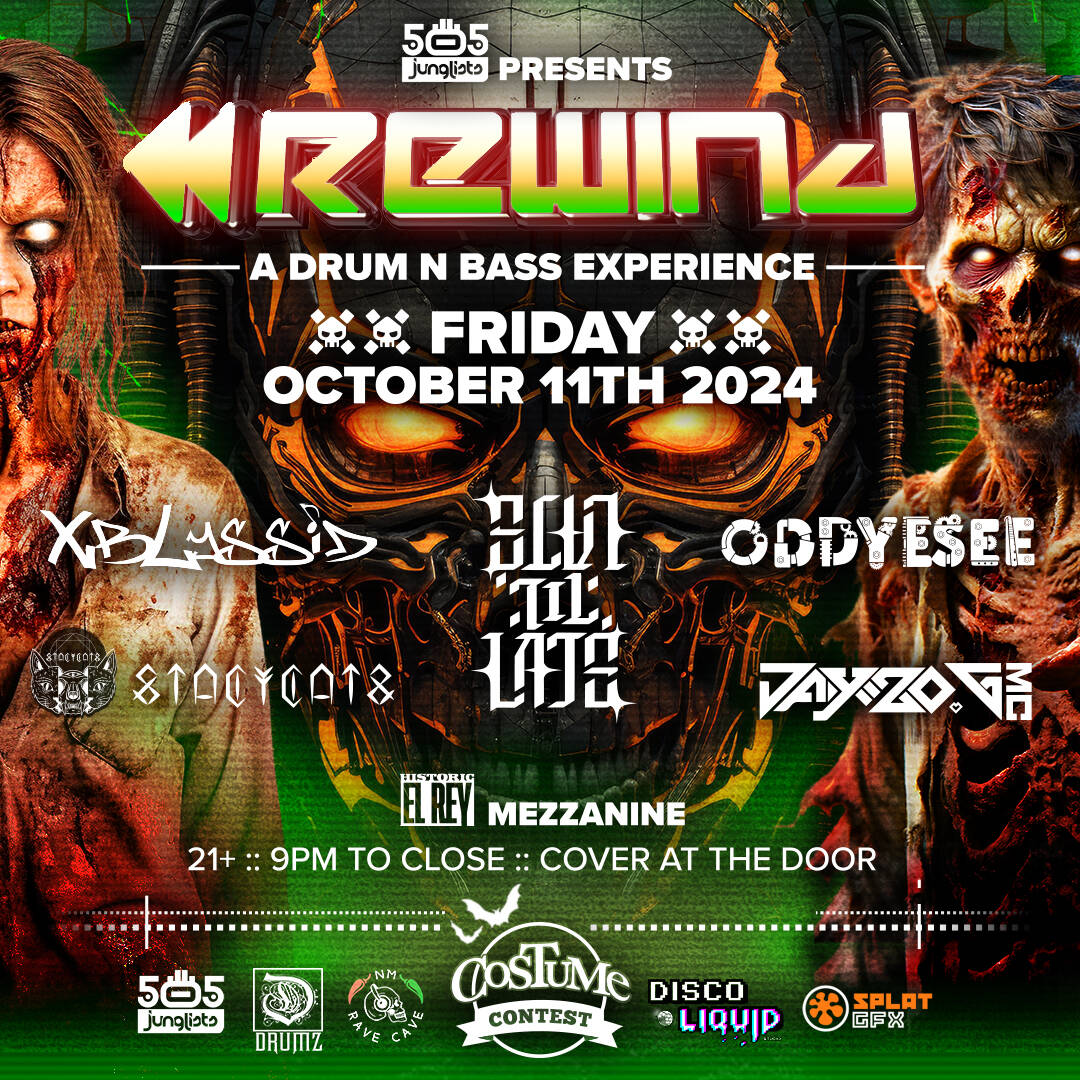 505 Junglists presents: REWIND:: A Drum n Bass experience on Friday, October 11, at El Rey Mezzanine! We've decided to celebrate Halloween early with an extra excuse to get dressed up. Come ready to dance around zombies, ghouls & ghosts for this DNB spooktacular costumes ready basslines shakin! You don't have to dress up to come dance, but we'd love it if you do & you might just win one of 3 cash prizes.