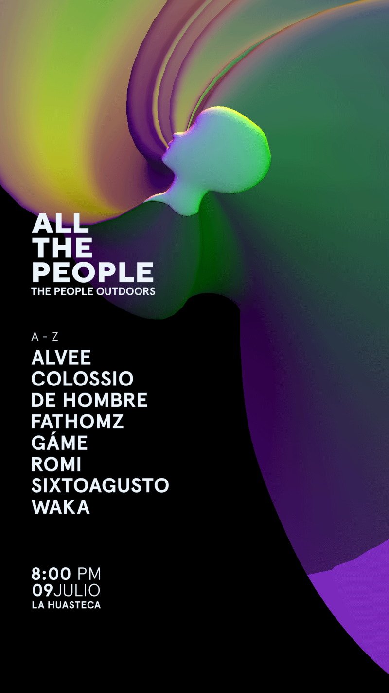 En esta edicion de The People Outdoors con la finalidad celebrar nuestra 6ta vuelta al sol les traemos "All The People" un rave donde podras disfrutar de una musica por mas de 12 hrs. De la noche a la mañana nos reuniremos en nuestra casa, La Huasteca; les presentaremos cada uno de los estilos musicales que nuestros artistas han ido desarrollando y evolucionando a lo largo de los años, cada uno de ellos cuenta con un sonido propio y original, que no solo los distingue uno del otro si no que se complementan muy bien para una noche como esta.