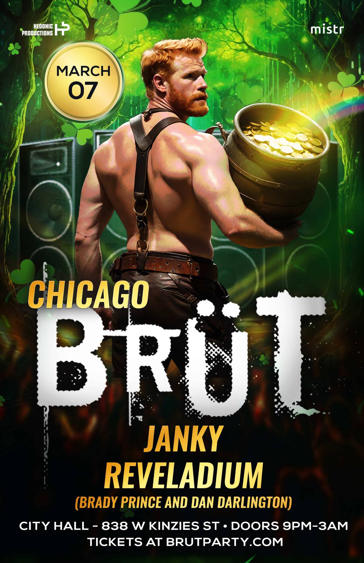 A new kingdom stands larger, louder, built to be taken. Inside these walls, the gold isn’t waiting at the end of the rainbow, it’s already moving through the crowd, in the bodies, the heat, and the shadows. BRÜT kicks things off with one of the most epic gay parties in Chicago, perfectly timed for the legendary St. Patrick’s Day Parade, the Saturday night one week before the holiday.