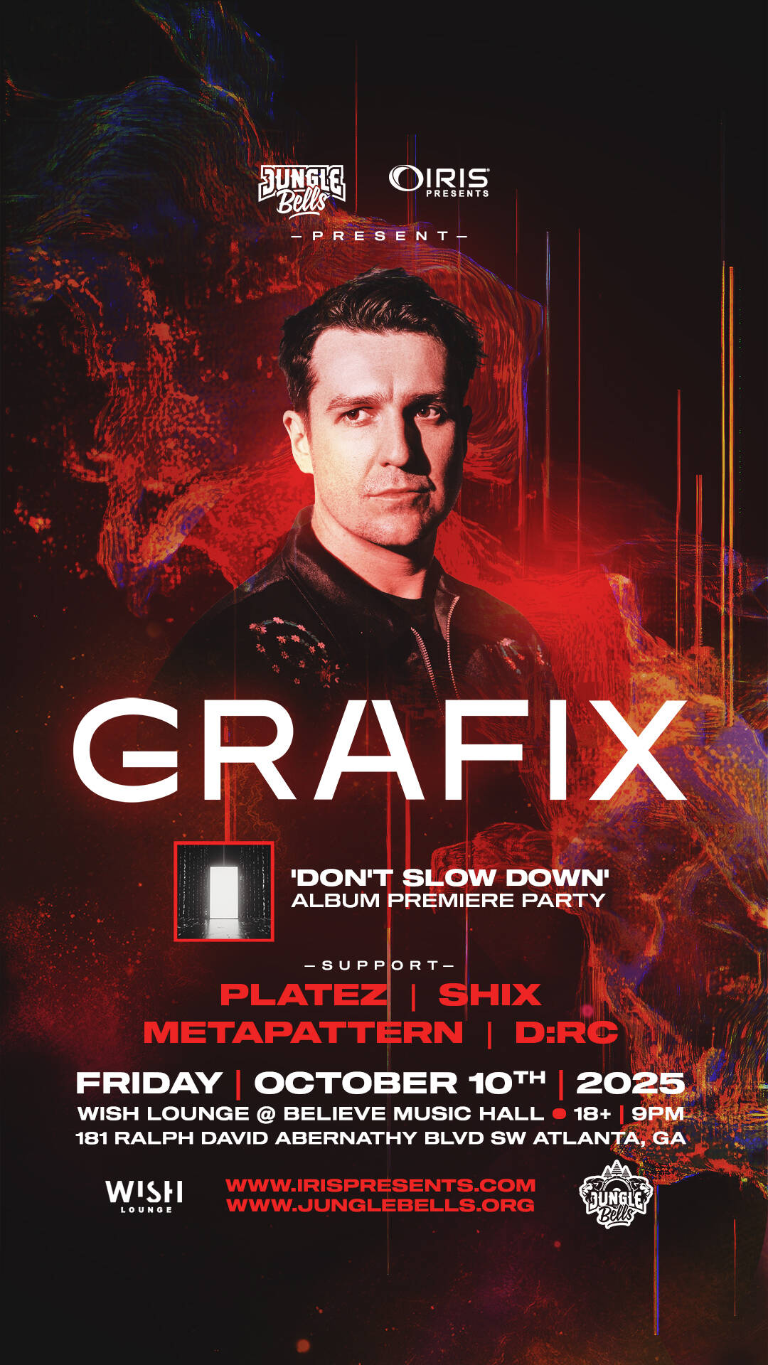 Jungle Bells + Iris Presents one of the most respected producers of UK Drum & Bass - GRAFIX - live in Atlanta on Fri, Oct 10th at Iris Presents' Wish Lounge. Come together to celebrate the US debut of his highly anticipated album, Don't Slow Down, the second solo studio album on his new Grafix Music imprint. After standout solo performances at Nocturnal, DnB Allstars, Creamfields, and Luquicity Festivals this Summer, he's bringing the heat with a special DnB set to Atlanta to celebrate his album release day.