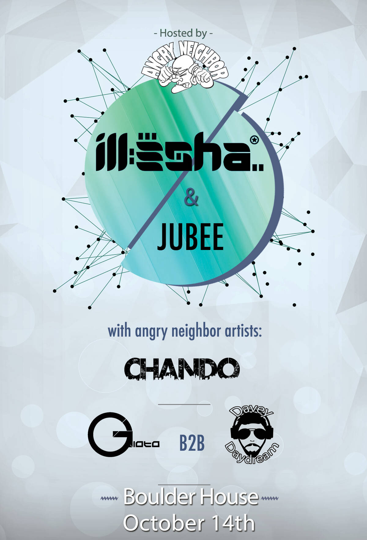 We are excited to bring ill-ēsha to Boulder House along with JuBee and his live band!! Angry Neighbor artists Chando, Gioto, and Davey Daydream will also be joining. More artists TBA!