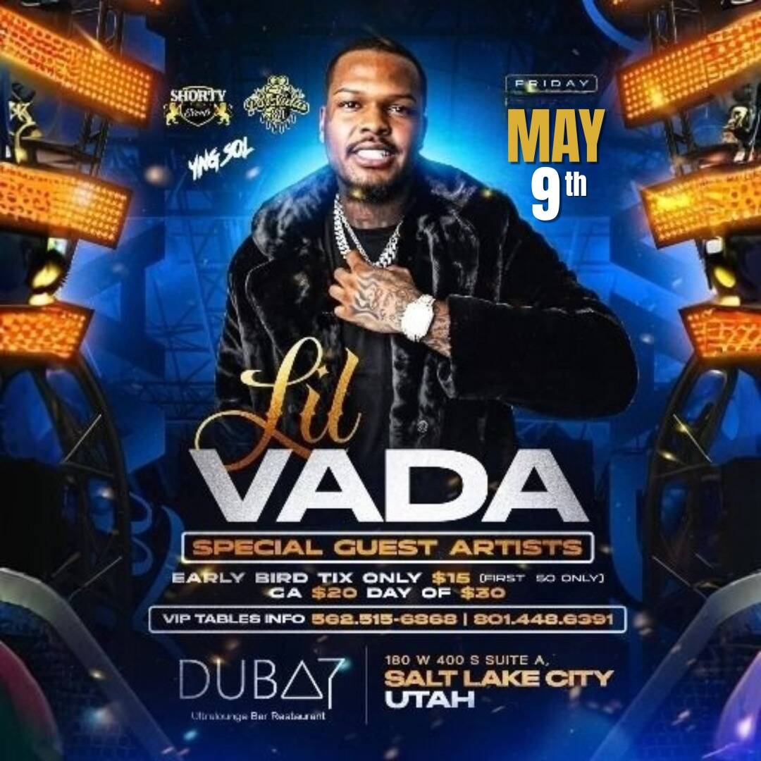Get ready for the LIL VADA CONCERT! Come join us for a night of awesome musicand good vibes. It's going to be an unforgettable experience with great beats and amazing energy. Don't miss out on the chance to see LIL VADA perform live and feel the excitement in the air. Grab your friends and get ready to dance the night away with the King of Utah YNG SOL & SHORTY EVENTS! Mark your calendars and get your tickets now for the LIL VADA CONCERT. It's going to be li