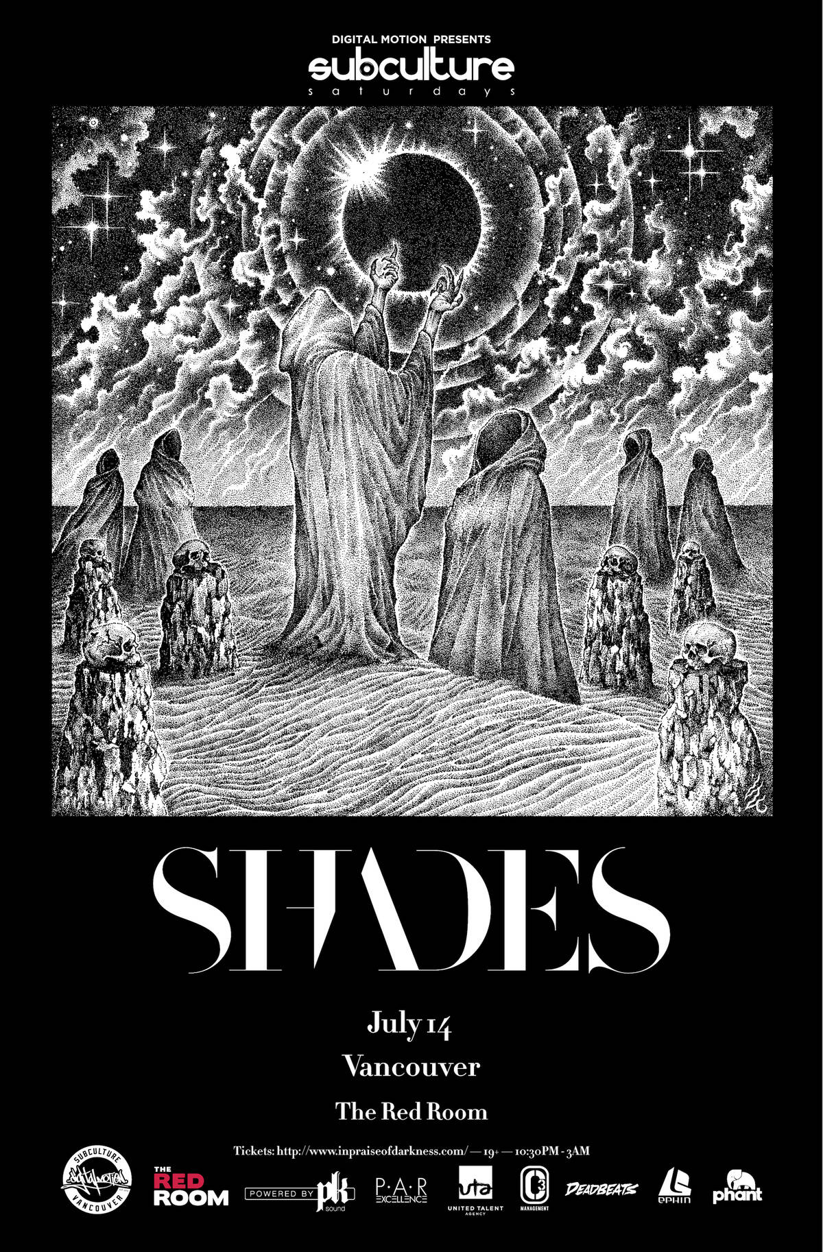 2018 will see the release of their debut full - length album, ‘In Praise Of Darkness’, signed to Zeds Dead's highly acclaimed imprint, Deadbeats Records. It is a 12 track saga of varying sounds and tempos, and includes the revered UK MC, Killa P. 2017 saw the release of their 4th EP, ’Night of the Dreadless Angel’, which is a graceful movement in bass music. It is the first release that sees SHADES collaborate with anyone else. As comrades and pioneers in the half -time, it made Ivy Lab the perfect partners.